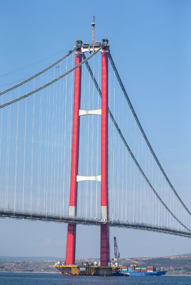 "GÜZERGAH 40 KİLOMETRE KISALACAK" Dünyada 2 bin metre orta açıklığın üzerinde ikiz tabliye olarak dizayn ve inşa edilen ilk köprü olarak tarihe geçecek. 318 metrelik kule yüksekliği ve 16 metrelik mimari amaçlı top mermisi figürüyle birlikte düşünüldüğünde köprü, deniz seviyesinden 334 metre yüksekliğe erişecek ve dünyanın en yüksek kulelerine sahip asma köprüsü olacak. Malkara-Çanakkale Otoyolu da güzergahı 40 kilometre kısaltacak."