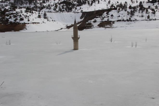 Gölün bahar mevsiminin ortasında buzla kaplı olmasının yanı sıra su altında kalan Pusat köyü camisinin minaresi de dikkat çekiyor. Son yıllarda gölde su seviyesi düştükçe minare su yüzeyine çıktı.