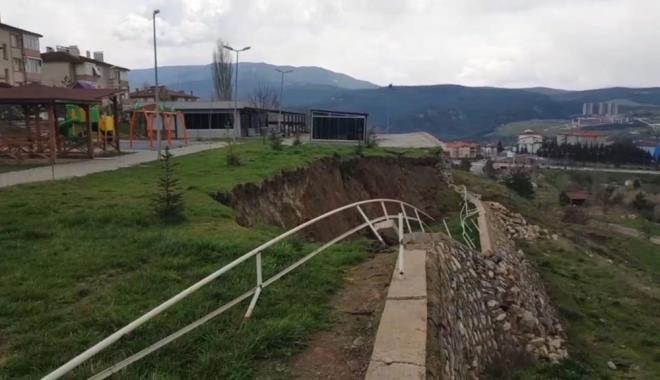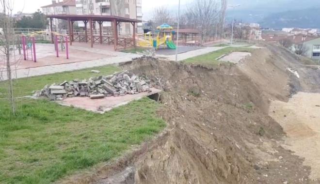 Karabük?te çocuk parkında heyelan meydana gelirken, 4 metre çökmenin olduğu alanda istinat duvarı yıkıldı.