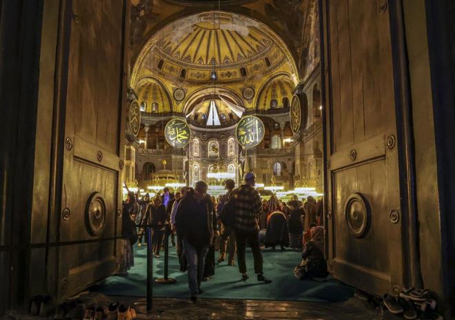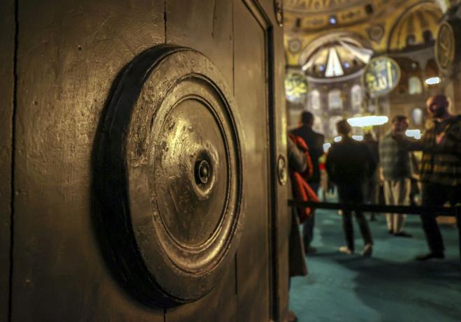 Ayasofya-i Kebir Cami-i Şerifi'nde, tahribatın meydana geldiği imparator kapısı, konservasyonu tamamlanarak onarıldı.