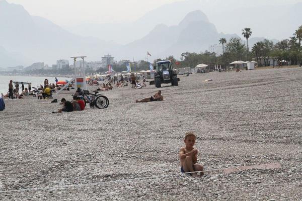 ANTALYA?da sıcak havayı gören vatandaşlar ve turistler sahillere sakın etti. Turizm sezonu için hazırlıkların sürdüğü dünyaca ünlü Konyaaltı Sahili'nde, bir traktörün tatilciler arasında düzenleme çalışması yapması ise şaşkınlık oluşturdu.