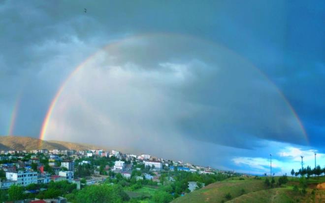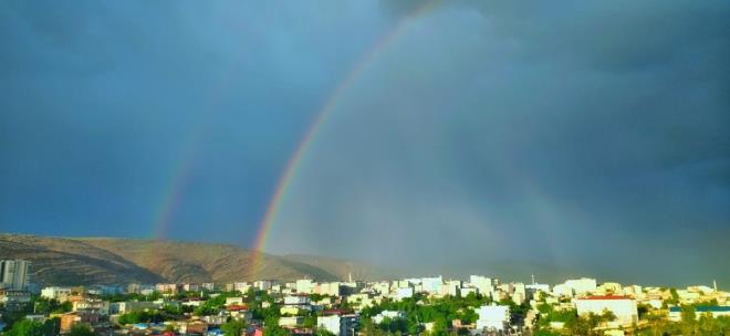 İHA'nın haberine göre; güneşin çıkmasının ardından şehrin üstünde gökkuşağı oluştu. Kartpostallık görüntüleri aratmayan o anlar, fotoğraf karelerine yansıdı.