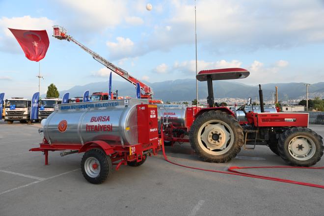Bursa Büyükşehir Belediyesi halkın can ve mal güvenliğini doğrudan ilgilendiren en önemli hizmetlerden biri olan itfaiye teşkilatını her geçen gün güçlendiriyor. Son olarak, özellikle kırsal mahallelerde olası yangınlara müdahale için alınan 25 adet traktör arkası yangın söndürme su tankeri ile ikisi merdivenli 7 itfaiye aracı daha hizmet filosuna dahil edildi.