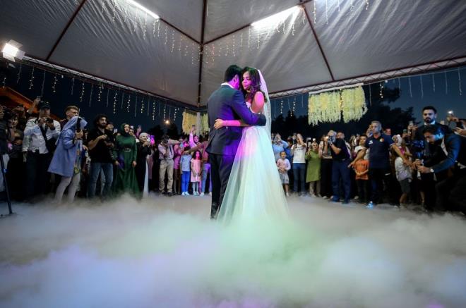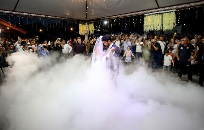 Yüzlerce kişinin katıldığı yemek programının ardından akşam saatlerinde törene gelen çift, alkışlar eşliğinde sahneye çıkarak dans etti.