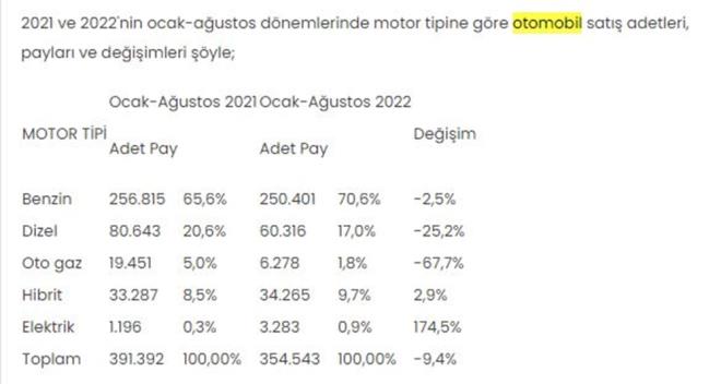 Ocak-Ağustos 2021'de yüzde 20,6 olan dizel otomobillerin satışlardan aldığı pay, bu yılın aynı döneminde yüzde 17'ye geriledi. Söz konusu dönemde benzinli otomobillerin payı yüzde 65,6'dan yüzde 70,6'ya yükselirken, oto gazlı otomobillerin payı yüzde 5'ten yüzde 1,8'e geriledi. Elektrikli otomobillerin toplam satışlardaki payı yüzde 0,3'ten yüzde 0,9'a ve hibrit otomobillerin payı da yüzde 8,5'ten yüzde 9,7'ye çıktı.