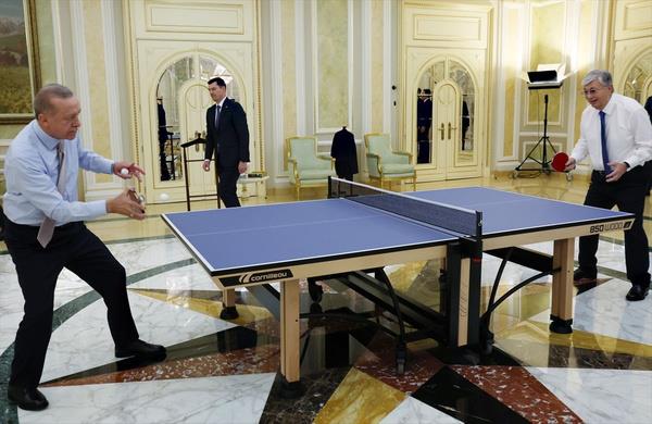 Cumhurbaşkanı Erdoğan, Astana'da görüştüğü Kazakistan Cumhurbaşkanı Tokayev ile karşılıklı masa tenisi oynadı.