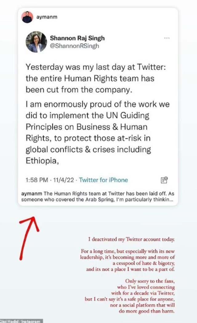 Hadid, son olarak Twitter'ın artık güvenli bir yer olmadığını belirterek, platformun yarardan çok zarar olduğunu söyledi.