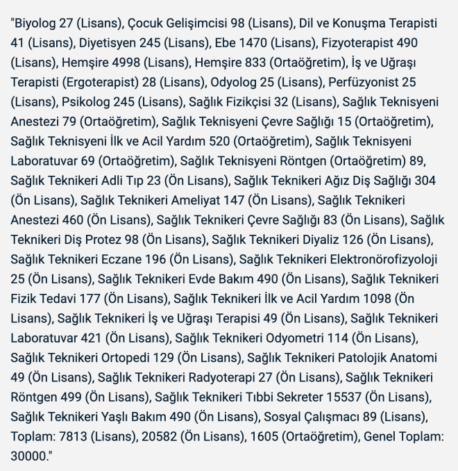 PERSONEL ALIMINDA 1. ETAP TAMAMLANDI Sağlık Bakanlığı bünyesinde görevlendirilmek üzere ilk etapta 15 bin 537 tıbbi sekreter ve 5 bin 831 hemşire alımı olmak üzere toplamda 30 bin personel alımı gerçekleştirildi.