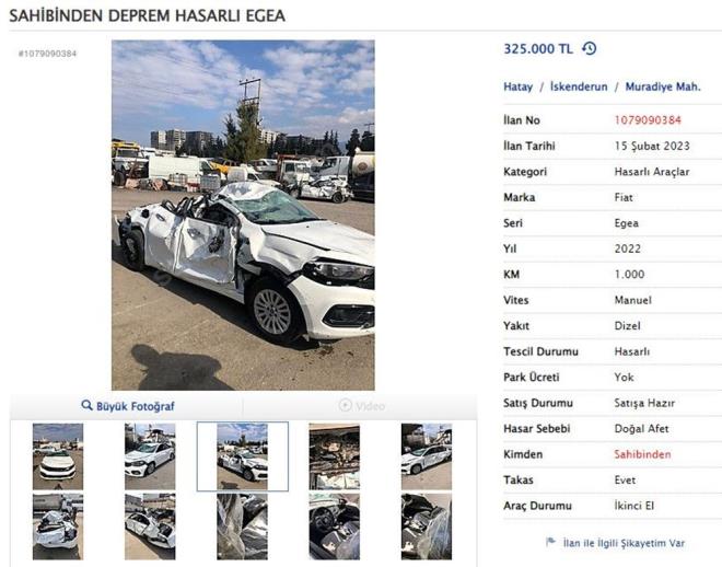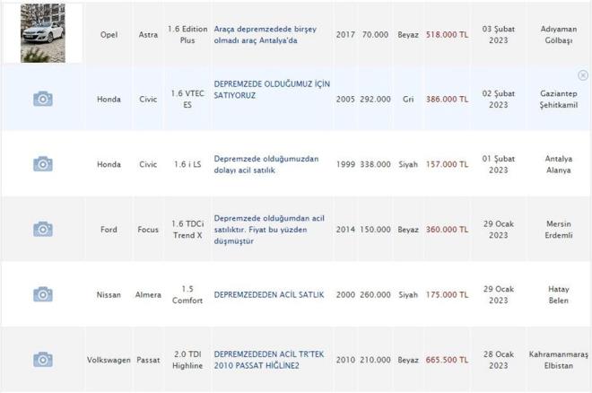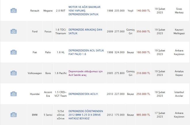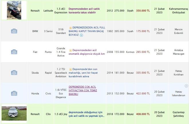 Bazı ilanlarda ise hasarsız ikinci el araçlar ?depremzededen? ya da ?deprem bölgesinden? başlıklarıyla satışa çıkarıldı.