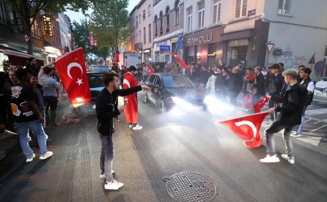 Brüksel'de Türk nüfusun yoğun yaşadığı Schaerbeek semtinde toplanan yüzlerce kişi, Türk bayraklarıyla sokaklara çıktı.
