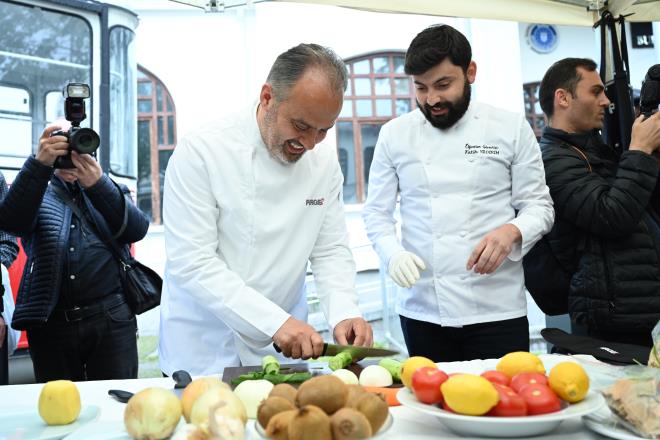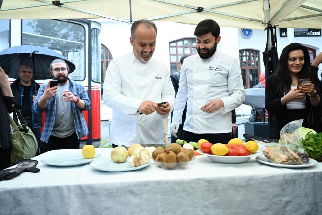 Açılış öncesi Bursa bıçağının yapım aşamasının sahnelendiği gösteri ilgiyle izlenirken, Başkan Aktaş, bıçağın keskinliğini masada sebze doğrayarak test etti.