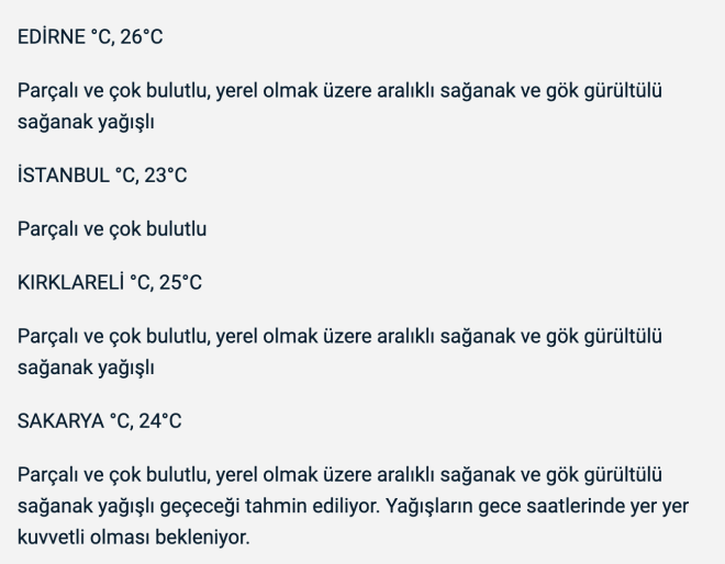 MARMARA BÖLGESİNDE HAVA DURUMU NASIL OLACAK? Parçalı ve çok bulutlu, Trakya ile Sakarya, Bursa, Balıkesir, Bilecik, Yalova ve Kocaeli çevrelerinde yerel olmak üzere aralıklı sağanak ve gök gürültülü sağanak yağışlı geçeceği tahmin ediliyor. Yağışların gece saatlerinde Sakarya ve Bilecik çevrelerinde yer yer kuvvetli olması bekleniyor.