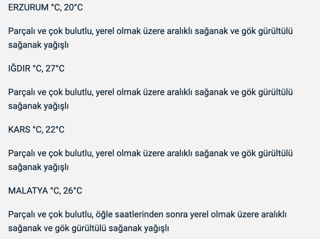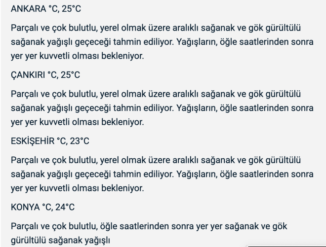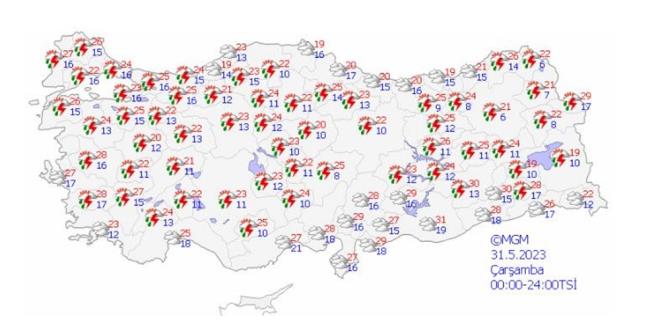BUGÜN HAVA NASIL OLACAK? Meteoroloji Genel Müdürlüğü tarafından yapılan son değerlendirmelere göre: Ülkemiz genelinin parçalı ve çok bulutlu, Trakya, Ege, Akdeniz'in iç kesimleri, İç Anadolu, Batı Karadeniz, Orta ve Doğu Karadeniz?in iç kesimleri, Doğu Anadolu(Şırnak ve Hakkari hariç), Güneydoğu Anadolu'nun batısı ile Balıkesir, Yalova, Sakarya, Kocaeli, Bilecik, Alanya, Hatay ve Diyarbakır çevrelerinin yerel olmak üzere aralıklı sağanak ve gök gürültülü sağanak yağışlı geçeceği tahmin ediliyor. Yağışların Kütahya, Afyonkarahisar, Denizli, Burdur ve Isparta'nın doğusu, Eskişehir, Ankara ve Çankırı ile gece saatlerinde Sakarya, Bilecik, Düzce ve Zonguldak çevrelerinde yer yer kuvvetli olması bekleniyor. Sabah saatlerinde İç Ege ile Samsun çevrelerinde yer yer yoğun olmak üzere sis ve pus olayı bekleniyor.