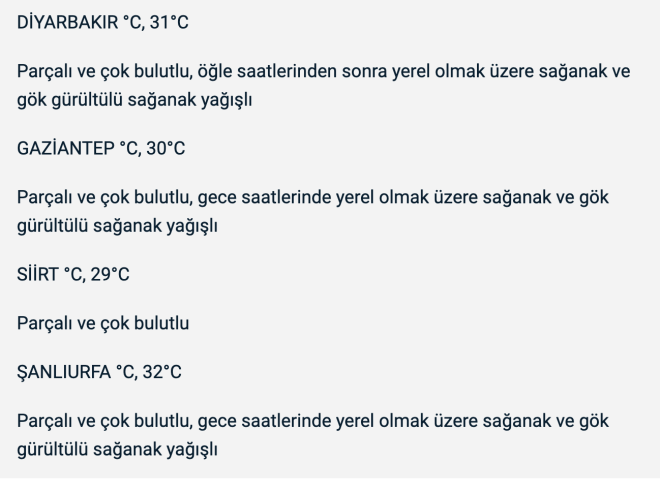GÜNEYDOĞU ANADOLU BÖLGESİNDE HAVA DURUMU NASIL OLACAK? Parçalı ve çok bulutlu, öğle saatlerinden sonra Diyarbakır çevreleri ile gece saatlerinden itibaren batı kesimlerinin yerel olmak üzere aralıklı sağanak ve gök gürültülü sağanak yağışlı geçeceği tahmin ediliyor.