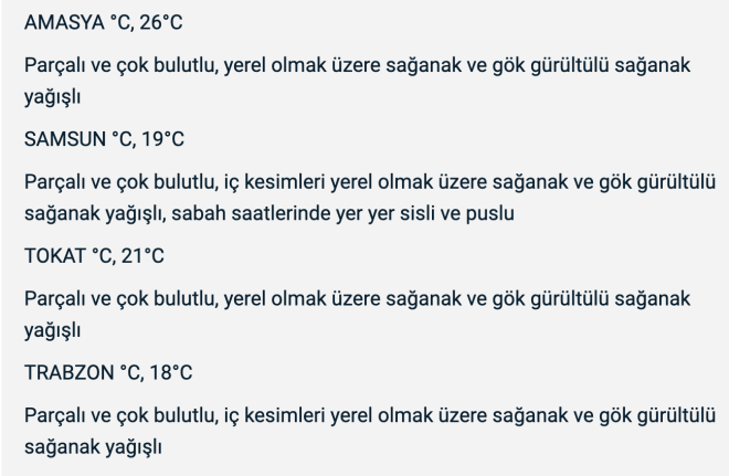 ORTA ve DOĞU KARADENİZ Parçalı ve çok bulutlu, bölgenin iç kesimlerinin yerel olmak üzere aralıklı sağanak ve gök gürültülü sağanak yağışlı geçeceği tahmin ediliyor. Sabah saatlerinde yer yer yoğun olmak üzere sis ve pus olayı bekleniyor.