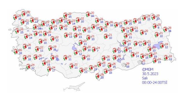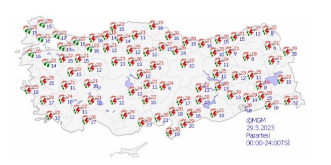 Yapılan son değerlendirmelere göre; Yağışların Kütahya, Afyonkarahisar, Denizli, Burdur ve Isparta'nın doğusu, Eskişehir, Ankara ve Çankırı ile gece saatlerinde Sakarya, Bilecik, Düzce ve Zonguldak çevrelerinde yer yer kuvvetli olması beklendiğinden sel, su baskını, yıldırım, ulaşımda aksamalar, yağış anından kuvvetli rüzgar, dolu yağışı gibi olumsuzluklara karşı dikkatli ve tedbirli olunmalıdır.
