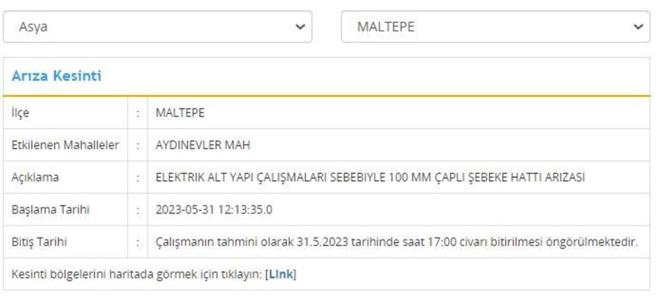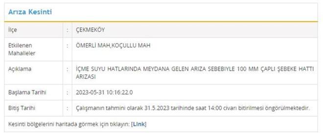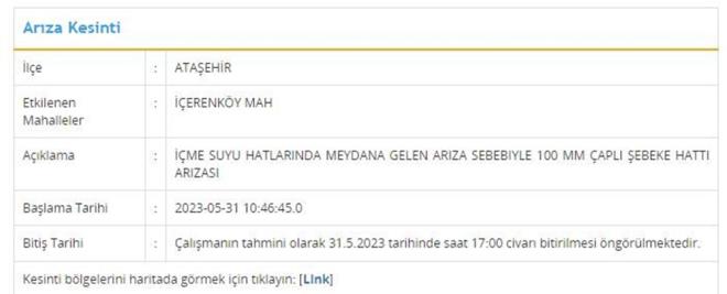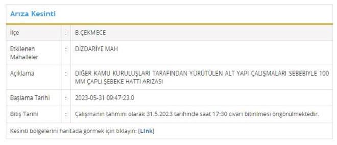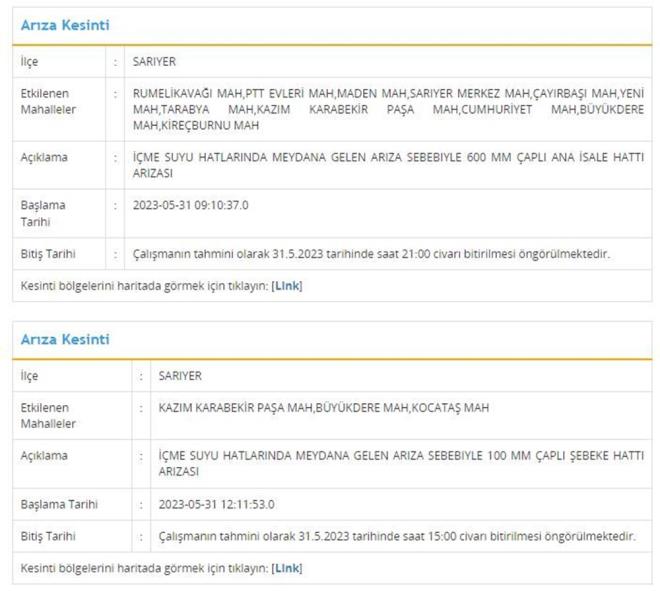 İSKİ'den yapılan açıklamada; 31 Mayıs'ta 09.00 ila 21.00 saatleri arasında; Sarıyer ilçesindeki Tarabya, Kireçburnu, Cumhuriyet, Çayırbaşı, PTT Evleri, Büyükdere, Sarıyer Merkez, Sarıyer Yenimahalle ve Rumeli Kavağı mahallelerine su verilemeyeceği kaydedildi.