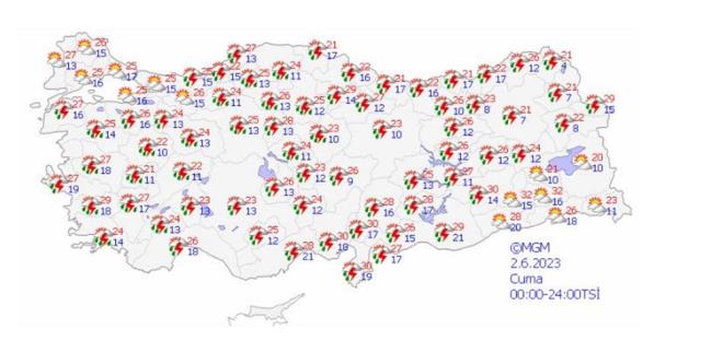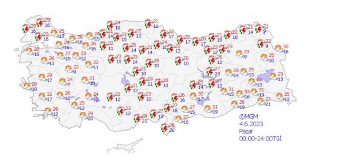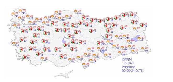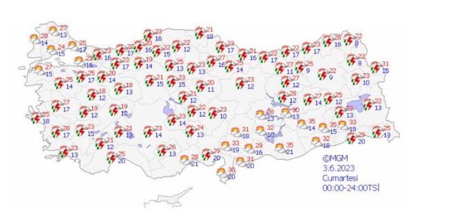 Hava sıcaklıklarının mevsim normalleri civarında seyredeceği tahmin ediliyor. Yağışların; İç Ege, Göller Yöresi, Orta Karadeniz?in iç kesimleri ile Balıkesir, Bilecik, Eskişehir, Yozgat, Sinop ve Samsun çevrelerinde yerel olmak üzere kuvvetli olması beklendiğinden sel, su baskını, yıldırım, ulaşımda aksamalar, yağış anında kuvvetli rüzgar, dolu yağışı gibi olumsuzluklara karşı dikkatli ve tedbirli olunmalıdır.