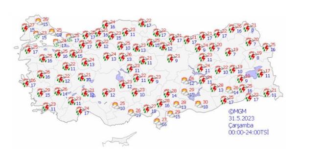 BUGÜN HAVA NASIL OLACAK? Meteoroloji Genel Müdürlüğü tarafından yapılan son değerlendirmelere göre: Ülkemiz genelinin parçalı ve çok bulutlu, Marmara?nın güney ve doğusu, Ege, Batı Akdeniz, İç Anadolu (Karaman hariç), Karadeniz, Doğu Anadolu (Malatya hariç), Güneydoğu Anadolu?nun doğusu, Edirne, Tekirdağ, Osmaniye ve Kahramanmaraş çevreleri ile Adana?nın iç kesimlerinin sağanak ve gök gürültülü sağanak yağışlı geçeceği tahmin ediliyor. Yağışların İç Ege, Göller Yöresi, Orta Karadeniz?in iç kesimleri ile Balıkesir, Bilecik, Eskişehir, Yozgat, Sinop ve Samsun çevrelerinde yerel olmak üzere kuvvetli olması bekleniyor.