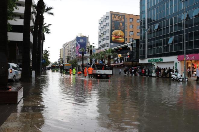 İzmir'in çiğli ilçesinde öğle saatlerinden itibaren etkili olan sağanak yağışta Anadolu Caddesi ile bağlı sokaklarda yer yer oluşan su birikintileri nedeniyle ulaşım güçlükle sağlandı. Zemin katlardaki konut ve iş yerlerinde su baskınları yaşandı.