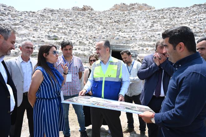 Bursa Büyükşehir Belediye Başkanı Alinur Aktaş, beraberindeki İznik Belediye Başkanı Kağan Mehmet Usta ile birlikte tarihi İznik Roma Tiyatrosu?nda devam eden çalışmaları yerinde inceledi. -