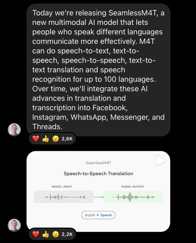 Mark Zuckerberg, Meta'nın Instagram kanalında yayınladığı duyuru ile yapay zeka dil modeli olan Seamless M4T'yi bugün piyasaya süreceklerini açıkladı.
