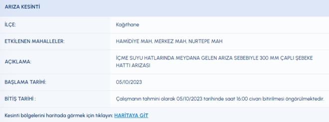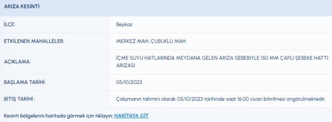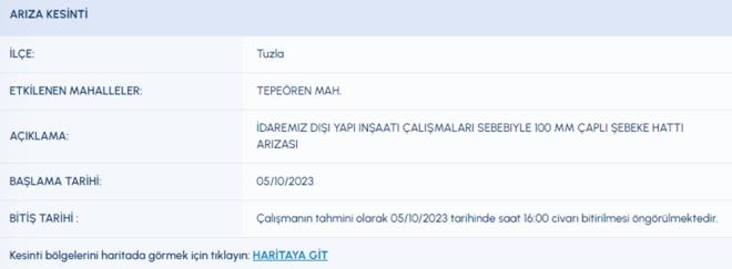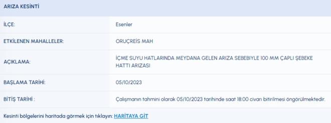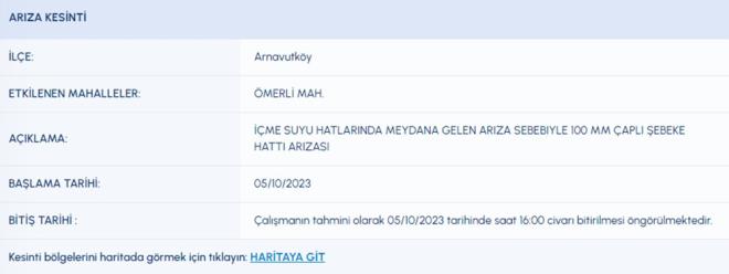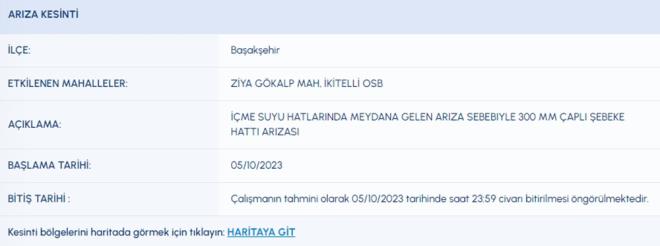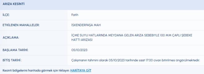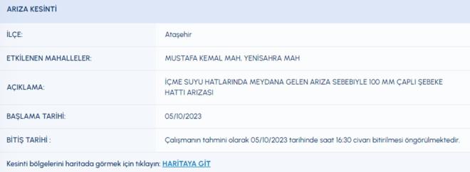5 EKİM İSKİ SU KESİNTİSİ LİSTESİ İSKİ (İstanbul Su ve Kanalizasyon İdaresi) planlı su kesintisi programını paylaştı. 5 Ekim tarihli kesinti programına göre, Arnavutköy, Ataşehir, Başakşehir, Beykoz, Esenler, Fatih, Kağıthane ve Tuzla'nın bazı mahallelerine su verilemeyecek. Peki, Arnavutköy, Ataşehir, Başakşehir, Beykoz, Esenler, Fatih, Kağıthane ve Tuzla'da sular ne zaman gelecek?