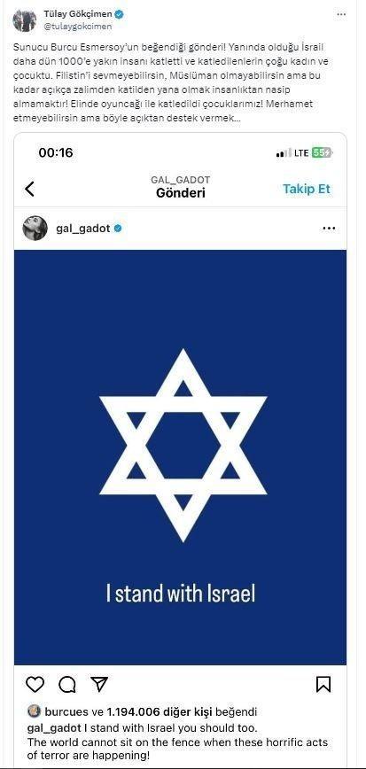 Burcu Esmersoy, İsrailli oyuncu Gal Gadot Varsona'nın 'İsrail'in yanındayım' ifadelerinin yer aldığı bir paylaşımı beğendi.