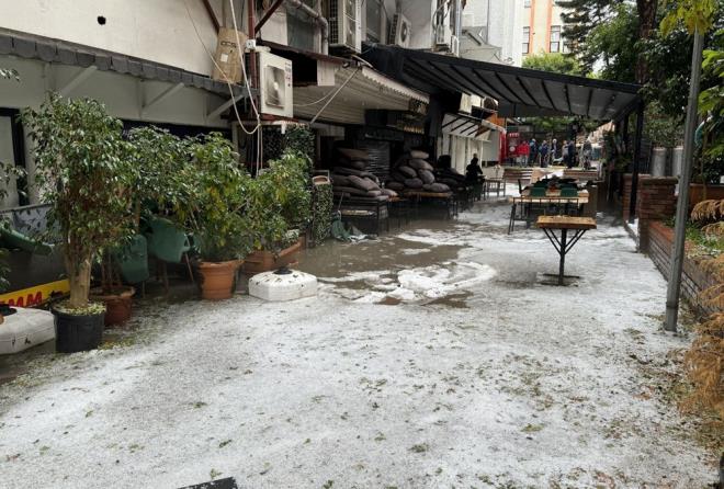 Kent merkezinde öğle saatlerinden itibaren yer yer dolu şeklinde etkili olan yağış nedeniyle beyaza bürünen sokak ve caddelerde su birikintileri oluştu, çok sayıda iş yerini su bastı.