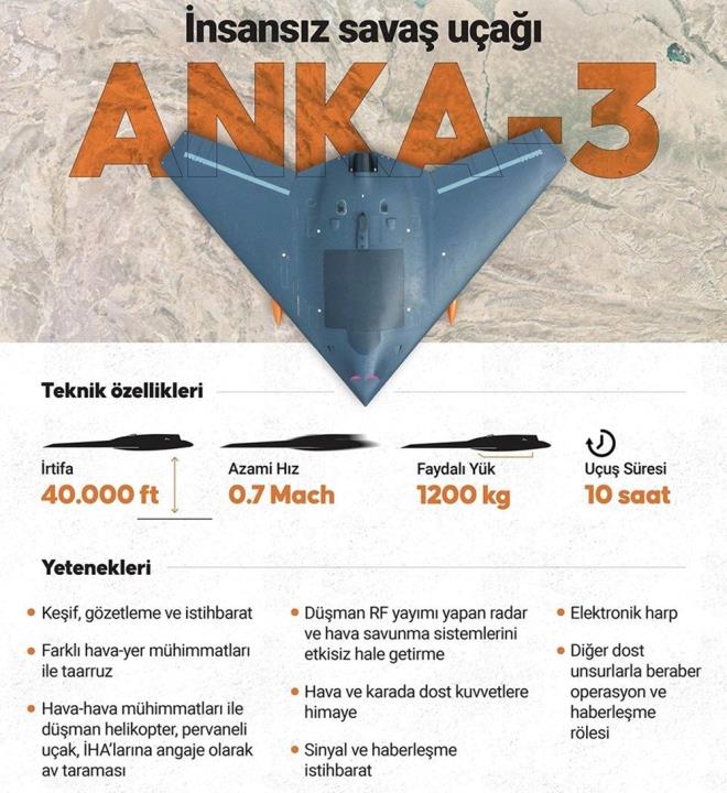 Türk Havacılık ve Uzay Sanayii Anonim Şirketi (TUSAŞ) tarafından geliştirilen insansız savaş uçağı ANKA-3 bugün ilk uçuşunu gerçekleştirdi.