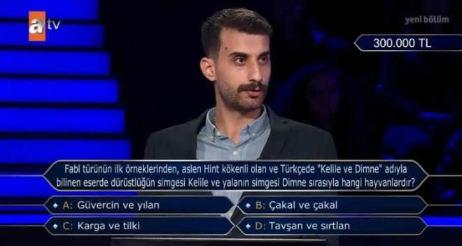 Yarışmacıya, 'Fabl türünün ilk örneklerinden, aslen Hint kökenli olan ve Türkçede 'Kelile ve Dimne' adıyla bilinen eserde dürüstlüğün simgesi Kelile ve yalanın simgesi Dimne sırasıyla hangi hayvanlardır?' sorusu soruldu -