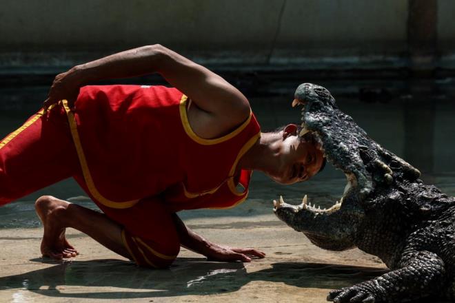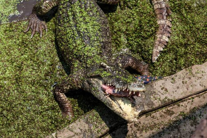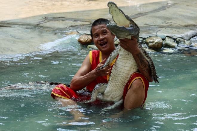 Ziyaretçiler, timsahları ellerine alarak fotoğraf çekildi ve çiğ etlerle besledi.
