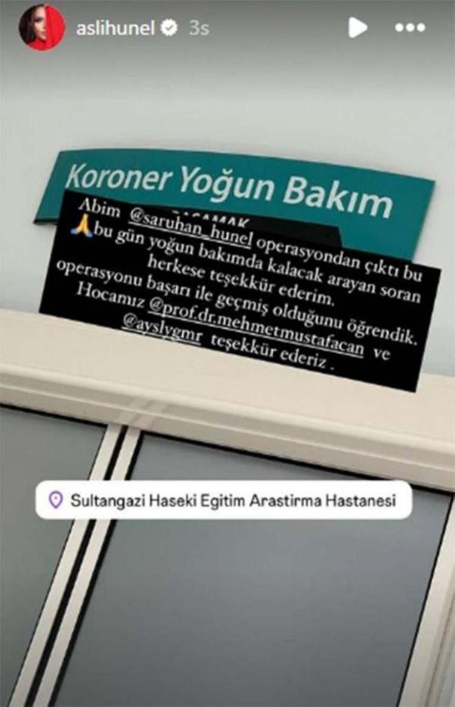 Ağabeyi için sevenlerinden dua isteyen Aslı Hünel, "Canım ağabeyim Saruhan Hünel bir süredir kalp ile ilgili sıkıntı yaşıyordu. Bu sabah kalp ameliyatına alındı. Sevenlerimiz dua ederse mutlu oluruz. Yer gök dua iyi olacaksın Allah'ın izniyle" açıklamasında bulundu.