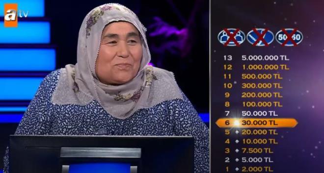 Sorunun doğru cevabından emin olmadığı için yanıtlamak istemeyen Menekşe Teyze yarışmadan çekildi ve 30 bin lira ödülün sahibi oldu.