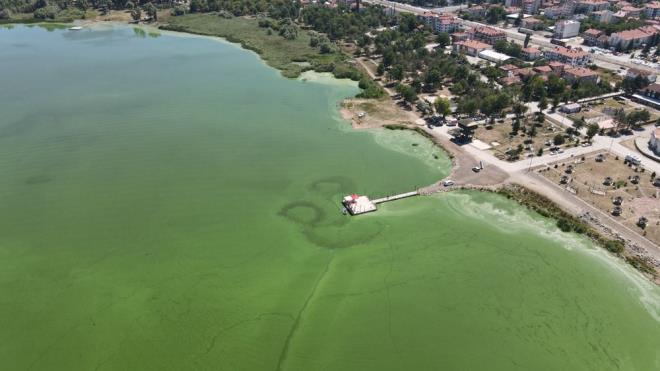 Alg patlaması ile yeşile dönen göl yüzeyi havadan drone görüntülendi.