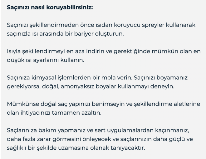 ISIYLA ŞEKİLLENDİRME VE KİMYASAL İŞLEMLER Düzleştiriciler, maşalar ve fön makineleri gibi ısıyla şekillendirme aletleri sık kullanıldığında saçınıza önemli zararlar verebilir. Aşırı ısı saçınızı kurutabilir, kırılganlığa, kırılmaya ve uçların kırılmasına yol açabilir. Benzer şekilde, saç boyama, perma veya düzleştirme gibi kimyasal işlemler saç tellerini zayıflatabilir ve dökülmeye daha yatkın hale getirebilir.