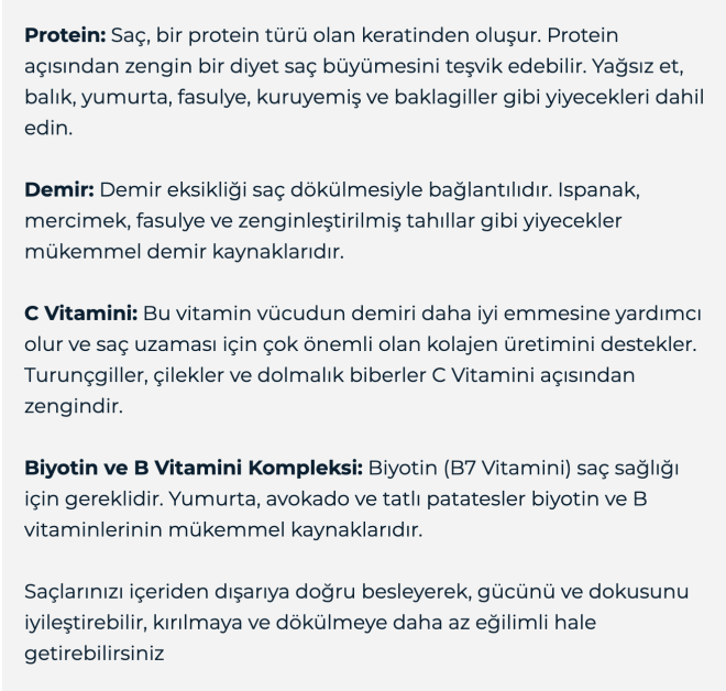 DENGELİ BESLENME Saç sağlığını etkileyen en önemli faktörlerden biri beslenmenizdir. Saç büyümesi büyük ölçüde tükettiğiniz besinlere bağlıdır, bu nedenle dengeli bir beslenme sağlamak esastır. Protein, vitaminler ve mineraller saç derisini beslemede ve saç köklerini güçlendirmede önemli rol oynar. Odaklanmanız gereken temel besinler şunlardır: