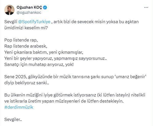 Oğuzhan Koç, doğrudan Spotify Türkiye hesabını ve diğer sanatçı arkadaşlarını etiketleyerek sitem dolu bir gönderi yayınladı.