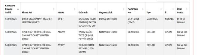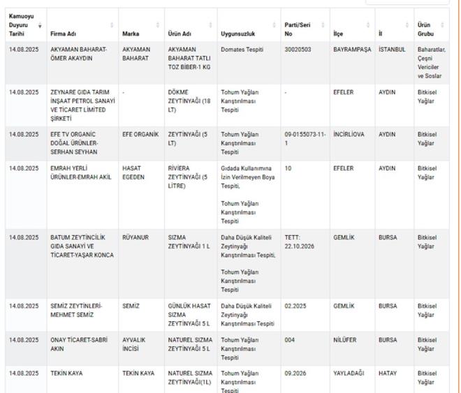 Bakanlığın 14 Ağustos 2025?te duyurduğu listeye göre uygunsuz bulunan markalar ve ürünler şöyle