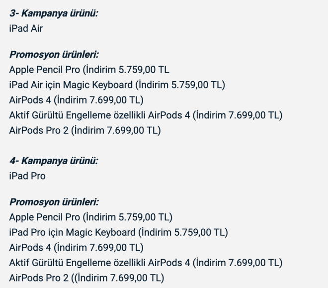 1- Kampanya ürünü: MacBook Air ve MacBook Pro Promosyon ürünleri: Magic Mouse (USB-C) - Beyaz Multi-Touch Yüzey (İndirim 4.099,00 TL) Magic Mouse (USB-C) - Siyah Multi-Touch Yüzey (İndirim 5.299,00 TL) Magic Trackpad (USB-C) - Beyaz Multi-Touch Yüzey (İndirim 6.699,00 TL) Magic Trackpad (USB-C) - Siyah Multi-Touch Yüzey (İndirim 7.999,00 TL) Aktif Gürültü Engelleme özellikli AirPods 4 (İndirim 10.299,00 TL) AirPods Pro 2 (İndirim 10.299,00 TL) Dokunmatik Kimlik ve Sayısal Tuş Takımına Sahip Magic Keyboard - Beyaz Tuşlar (İndirim 9.199,00 TL) Dokunmatik Kimlik ve Sayısal Tuş Takımına Sahip Magic Keyboard - Siyah Tuşlar (İndirim 9.999,00 TL) 2- Kampanya ürünü: iMac Promosyon ürünleri: Aktif Gürültü Engelleme özellikli AirPods 4 (İndirim 10.299,00 TL) AirPods Pro 2 (İndirim 10.299,00 TL)
