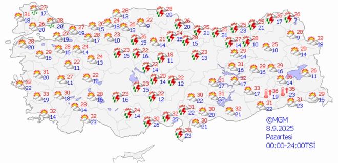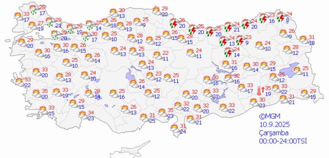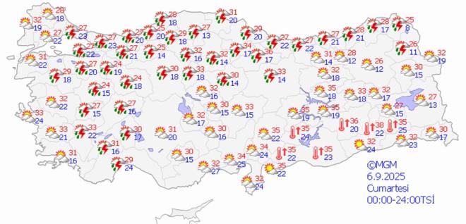 Hafta sonu yağışlı havayla birlikte yurt genelinde sıcaklıkların mevsim normalleri civarına kademeli olarak düşecek. Hava sıcaklıkları hafta sonu Ankara'da 30 ila 27, İstanbul'da 28 ila 29 ve İzmir'de ise 34 ila 35 derecelerde seyredecek.