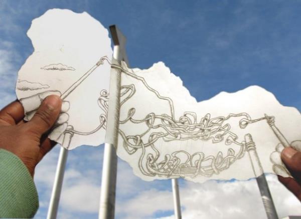 Bu çalışmalarda genellikle gerçek bir arka plan üzerine karakalem el çizimini koyan sanatçı, elinin her çalışmada görülmesi ile sanat, sanatçı ve izleyici arasındaki yakın bağlantıyı sergiliyor.