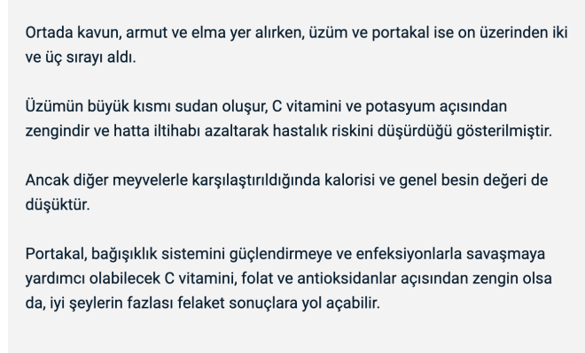 British Journal of Dermatology dergisinde yayınlanan araştırma, yüksek oranda narenciye tüketimi ile cilt kanseri riskinin artması arasında yüksek bir korelasyon olduğunu ortaya koydu. Uzmanlar bunun meyvelerin ışığa duyarlı hale getirme özelliğinden kaynaklandığını düşünüyor ancak bu bulguların ve uzun vadeli sağlık üzerindeki etkilerinin netleştirilmesi için daha fazla araştırmaya ihtiyaç var. Bununla birlikte, C vitamini sağlıklı cilt, kan damarları, kemikler ve kıkırdaklar için gereklidir ve bu vitaminin eksikliği iskorbüt hastalığına yol açabilir. NHS, günlük beslenmenizden ihtiyacınız olan tüm C vitaminini alabileceğinizi belirtse de, bu vitamin vücutta depolanamadığı için bazı kişilere takviye almaları önerilebilir.