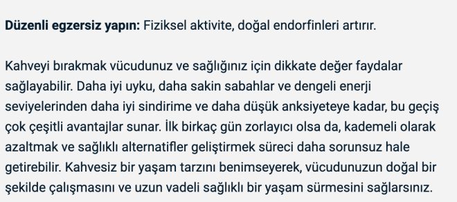 RUH HALİ ÜZERİNDEKİ FAYDALARI Kafein, merkezi sinir sistemini geçici olarak uyarır ve uyanıklığı artırır. Zamanla, kahve tüketilmediğinde sinirlilik ve ruh hali değişimlerine yol açan bağımlılık gelişebilir. Kahveyi bırakarak vücudunuz doğal enerji ve ruh hali mekanizmalarını düzenleyebilir. Birçok kişi, kafein artışlarına güvenmeden gün boyunca daha dengeli ruh halleri, gelişmiş odaklanma ve daha net düşünme fark eder.