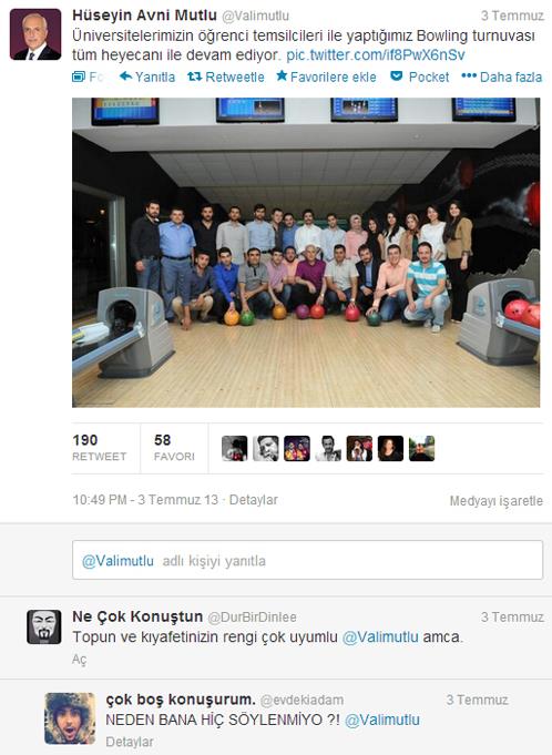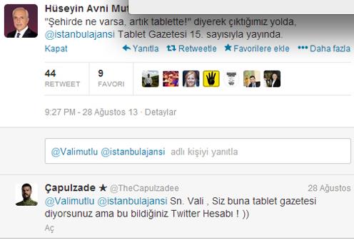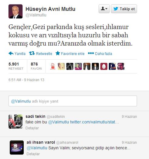 Twitter'da 540 binin üzerinde takipçisi olan Vali Mutlu, özellikle Gezi Parkı eylemleri süresince aktif olarak kullandığı bu mecrada oldukça popüler bir konuma gelmişti. Kendisine Twitter'dan yöneltilen sorulara çok sık olmasa da bazı durumlarda cevap verdiği bilinen Mutlu'ya takipçilerinden gelen bazı sorular o kadar ilginç ve yaratıcı ki, eminiz ki Vali Mutlu bile bu tweet'lere nasıl geri dönüş yapacağını bilemiyordur.