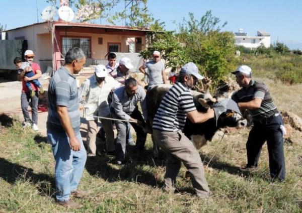 Korkunç! Şanlıurfa'da sahibinin elinden kaçan boğa, sıkıştırıldığı apartmanın önündeki korkuluk demirlerine saplanarak yaralandı.