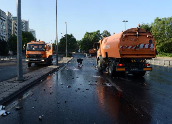 Ankara'da, Taksim Gezi Parkı'ndaki olayları protesto eden grubun eylemlerinin ardından, belediye ekipleri sabahın erken saatlerinde caddeleri temizledi.
