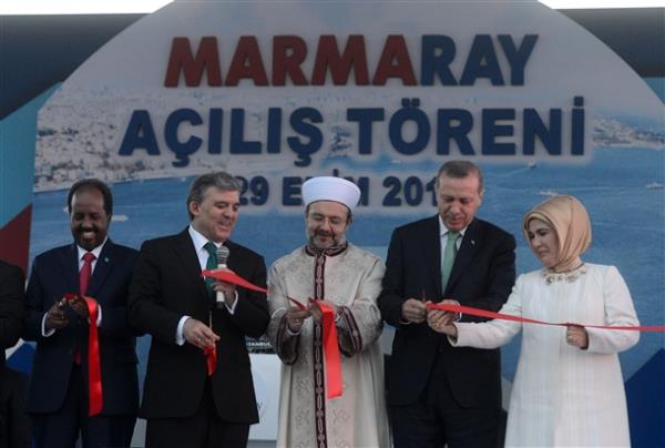 Asya ile Avrupa arasında, denizin altından kesintisiz demiryolu ulaşımı sağlayacak, dünyanın alanındaki önemli projelerinden Marmaray'ın açılış töreni Üsküdar'da yapıldı. Törene Başbakan Recep Tayyip Erdoğan (sağda) ve Somali Cumhurbaşkanı Hasan Şeyh Mahmud (solda) da katıldı.