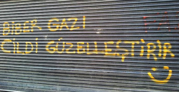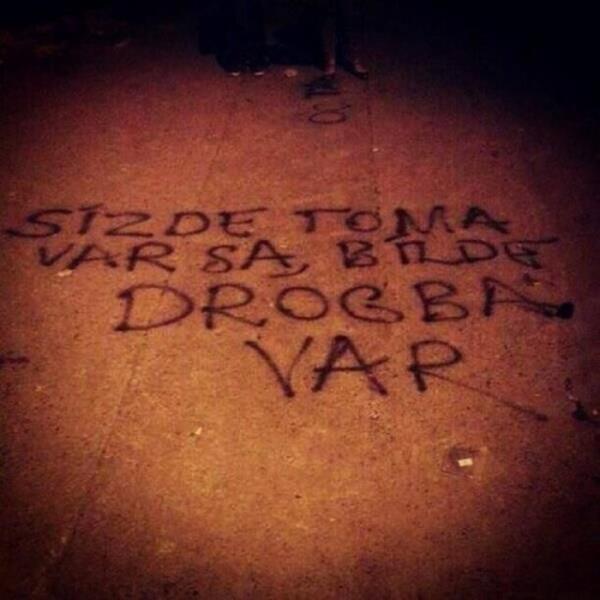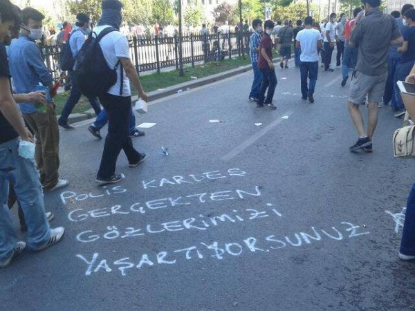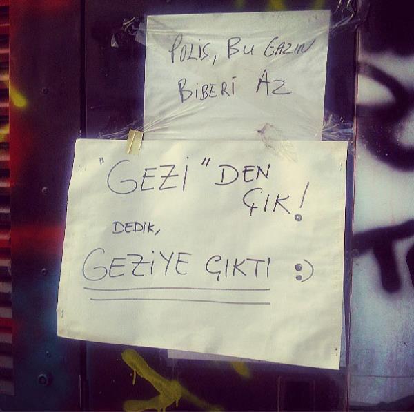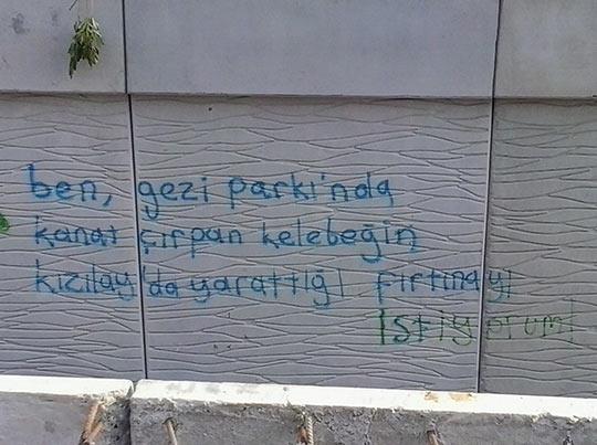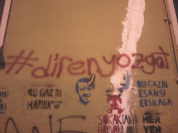 Taksim'deki Gezi Parkı protestolarında şiddet giderek yerini mizaha bırakıyor. Yaratıcılığın tavan yaptığı duvar yazıları, protesto sloganları ise hız kesmeden devam ediyor.
