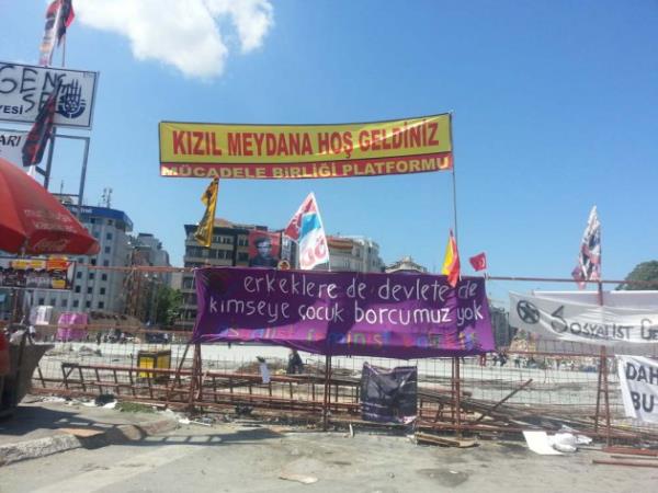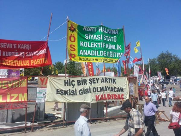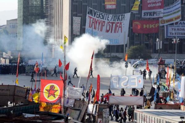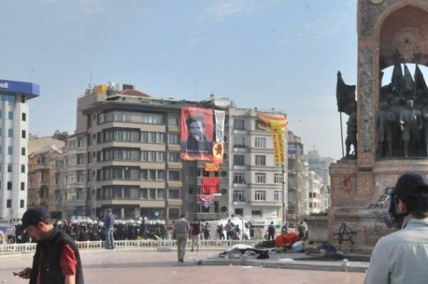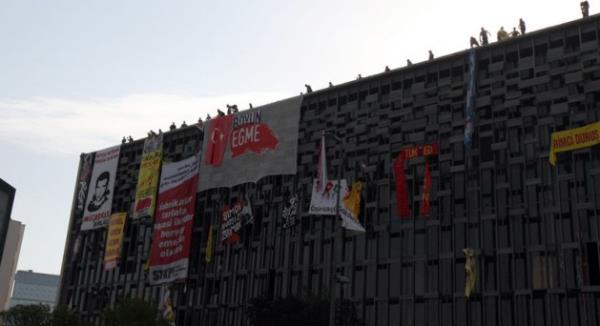 Taksim Gezi Parkı'nda böyle bir tablo varken, asılan pankartlarda kullanılan dil ise dikkatlerden kaçmadı. Özellikle Atatürk Kültür Merkezi'ne asılan ve polis tarafından indirilen pankart ve afişlerde ‘çevre duyarlılığı' konu edinen ifadeler yerine AK Parti ve Başbakan Recep Tayyip Erdoğan'ı hedef alınması eylemlerin hangi amaca hizmet ettiğini açıkça gösteriyor.